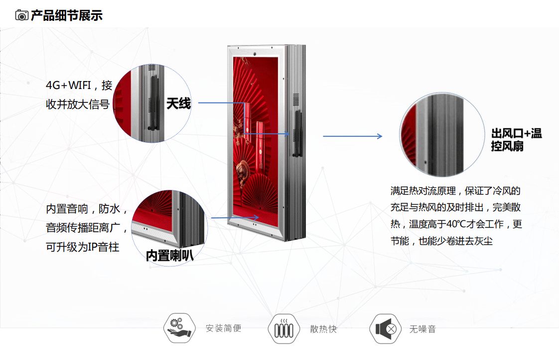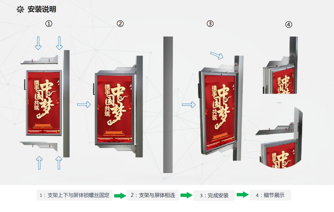 400*800mm全鑄鋁雙面LED燈桿屏,是一款依托互聯(lián)網(wǎng),物聯(lián)網(wǎng)等信息技術(shù)為基礎(chǔ),作為智慧城市的顯示終端,能夠?qū)崿F(xiàn)遠(yuǎn)程集群管理操控的戶外終端設(shè)備。全鑄鋁LED燈桿屏,箱體采用鋁材質(zhì),箱體輕薄,安裝簡單操作方便,適配于不同樣式、高度的智慧燈桿。它具備外觀靚麗、輕盈、時尚、亮度高、高顯色系數(shù)、防水、防爆、防雷等特點(diǎn)的視頻播放裝置,全鑄鋁智慧燈桿屏適用于各高速、交通要道、景區(qū)、賽事場館等。