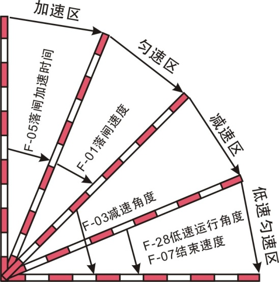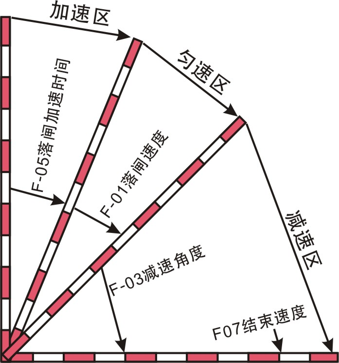 以該速度結(jié)束落閘,過小將導(dǎo)致關(guān)不到位,過大將導(dǎo)致晃動(dòng)。如果F-28命令設(shè)置了落閘低速角度,并且在有效的范圍內(nèi),則在低速勻速區(qū)以該速度運(yùn)行。