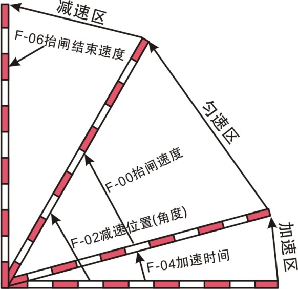 范圍:45-100,默認(rèn):90,大于等于90度或者小于等于F-02抬閘減速角度則無效。在抬閘的過程中設(shè)置了一個(gè)低速區(qū)域,當(dāng)抬閘角度達(dá)到設(shè)定的角度,則以F-06抬閘結(jié)束速度運(yùn)行,知道抬閘到位。