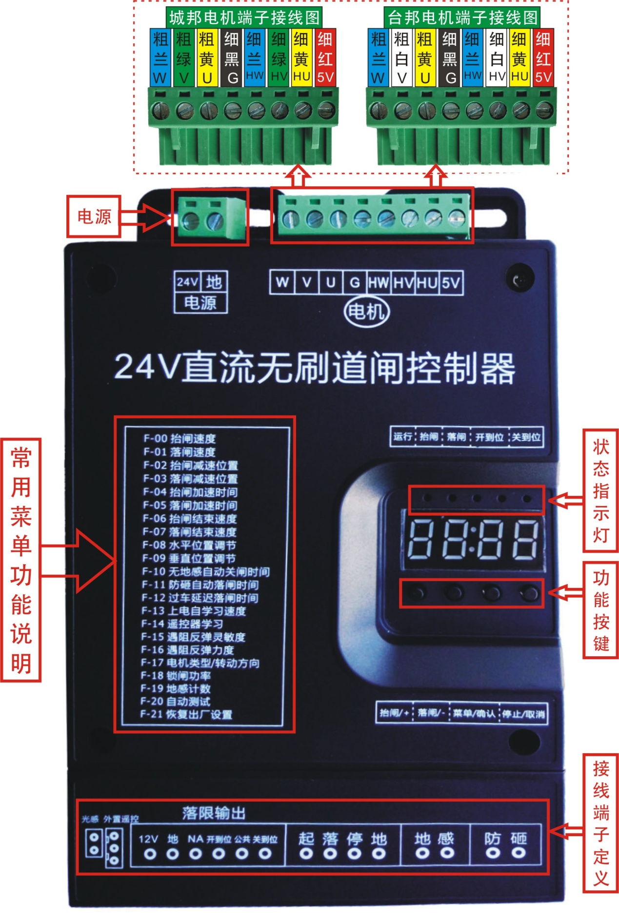 一般情況下在0和1之間選擇,當(dāng)按“抬閘/+”按鍵道閘起桿,則說明電機(jī)類型和轉(zhuǎn)動(dòng)方向的選擇是正確的。城邦電機(jī)在0、1之間選擇,臺(tái)邦電機(jī)在2、3之間選擇。