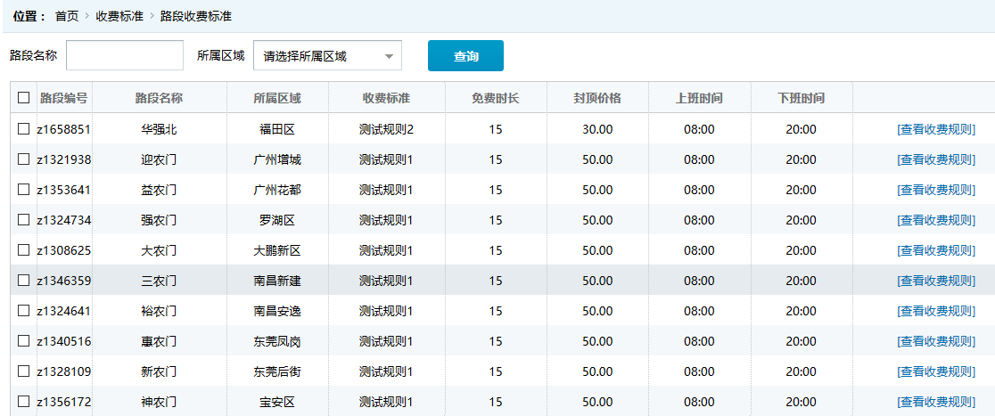 ●路段收費標(biāo)準(zhǔn):根據(jù)系統(tǒng)添加的路段,對應(yīng)的收費標(biāo)準(zhǔn)記錄,可點擊“查看收費規(guī)則”了解收費標(biāo)準(zhǔn)的明細(xì),每個路段可以執(zhí)行不同的收費規(guī)則。