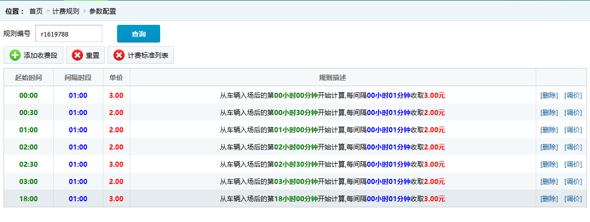 ●配置收費規(guī)則:設(shè)置收費標(biāo)準(zhǔn)中,按時段收費的規(guī)則明細(xì),收費規(guī)則信息可更改,規(guī)則明細(xì)記錄可調(diào)整。
