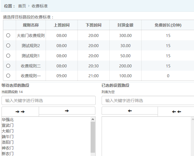 ●添加收費規(guī)則:在列表中可選中指定的收費標(biāo)準(zhǔn),對應(yīng)到多個路段中,如圖: