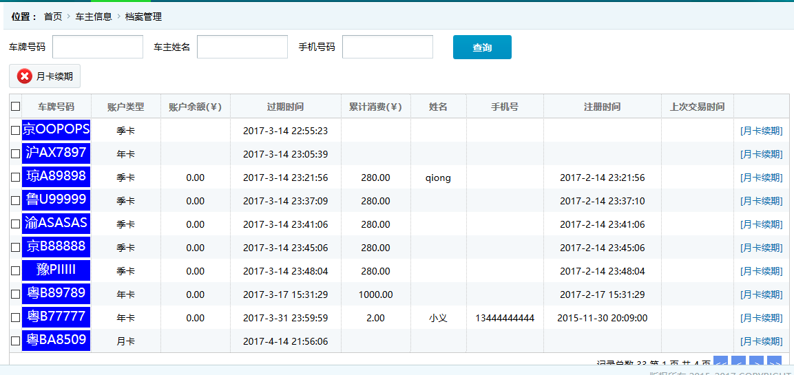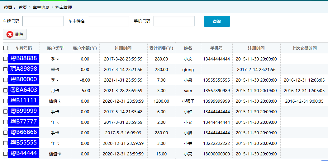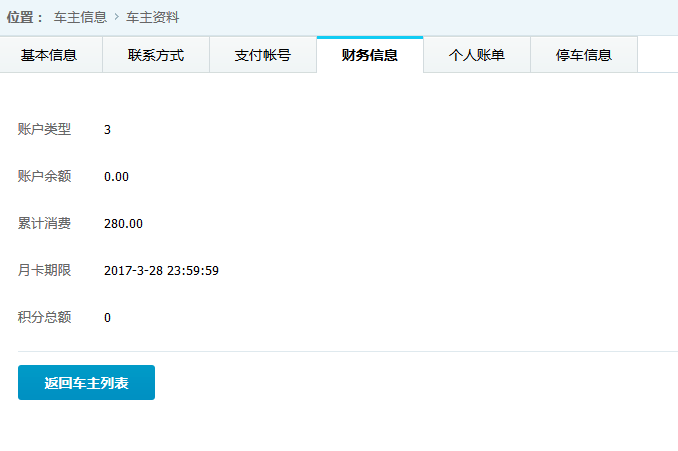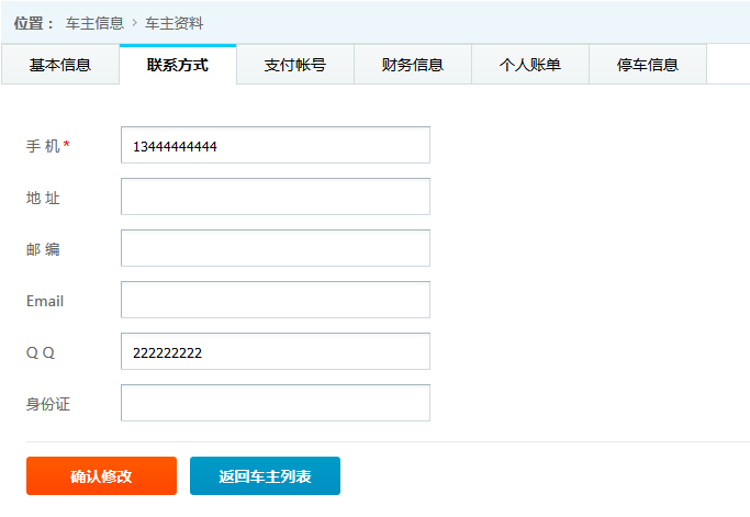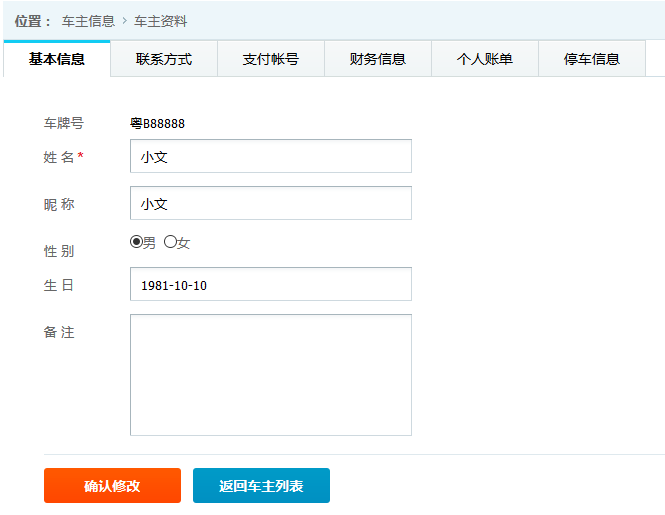 ●車主詳細(xì)信息 查看并維護(hù)車主的基本信息,旭歐科技系統(tǒng)中自動為進(jìn)場停車的車輛建立會員賬戶,方便交費充值等服務(wù)。在此功能中,管理員可對車主詳細(xì)信息查看并修改,如下圖: