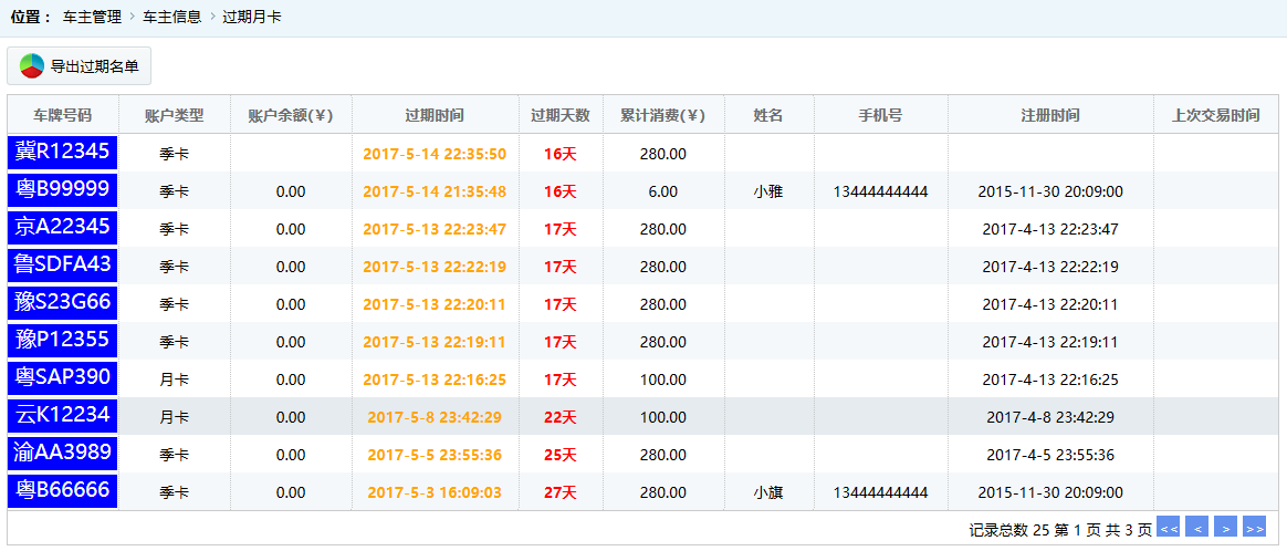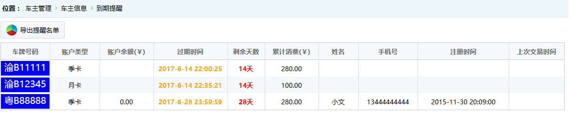 ●到期提醒 顯示月卡車主中離到期時間小于30天的賬戶信息,如圖: