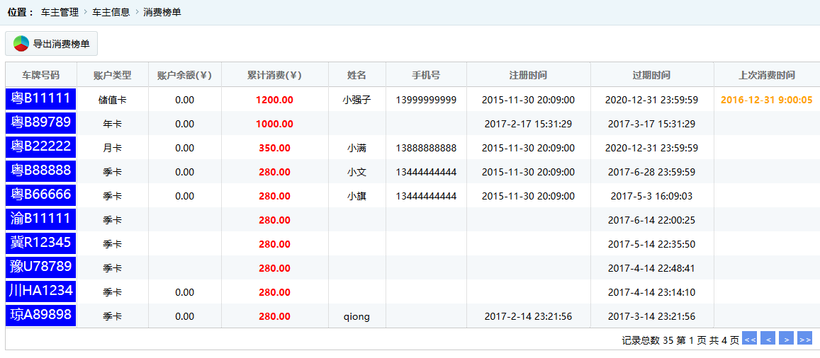 ●消費榜單 按照累積消費的總金額從大到小排序,默認(rèn)顯示前幾位累積消費多的車主用戶。如圖: