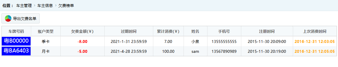●欠費榜單 按照累積欠費的總金額從大到小排序,默認(rèn)顯示前幾位累積欠費多的車主用戶。如圖: