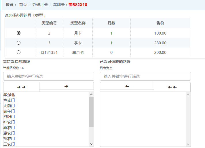 點擊“下一步”進(jìn)入月卡配置面板,選擇相應(yīng)的月卡類型,和支持停放的路段進(jìn)行開通。(本系統(tǒng)中支持開啟全部路段和指定路段)