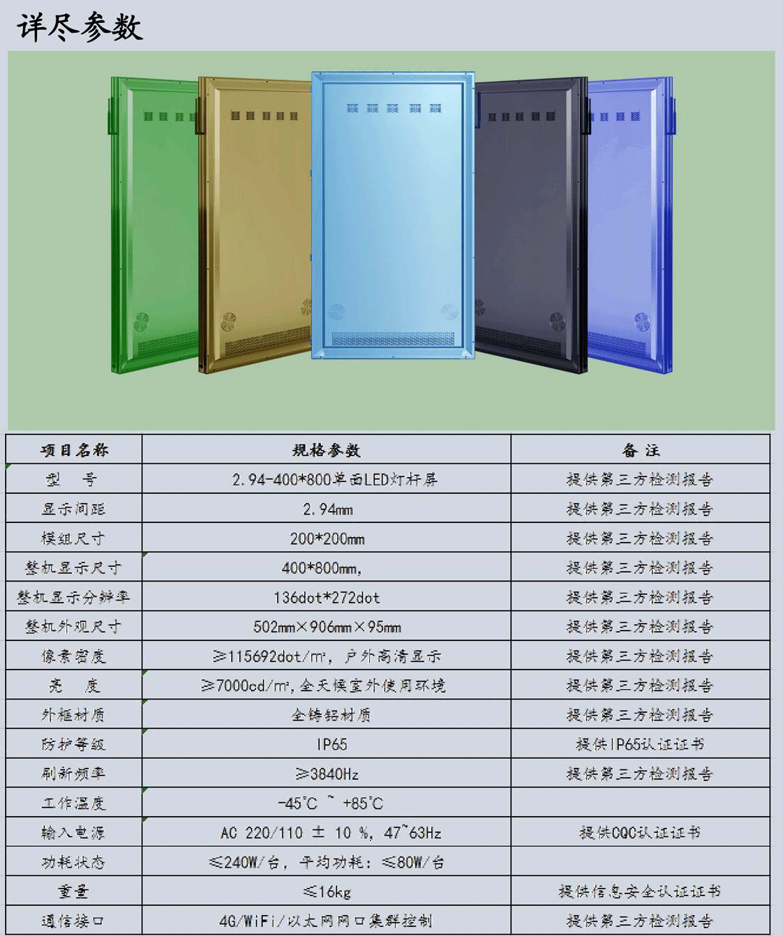 一款依托互聯(lián)網(wǎng)、物聯(lián)網(wǎng)等信息技術(shù)為基礎(chǔ),作為智慧城市的顯示終端,能夠?qū)崿F(xiàn)遠(yuǎn)程集群管理操控的戶外終端設(shè)備。帶視頻監(jiān)控、語音廣播以及亮度自動(dòng)調(diào)節(jié),專為戶外場(chǎng)景設(shè)置,設(shè)有防水、防雷等功能,設(shè)有防水防雷等功能,亮度水平≥7000it,專為戶外場(chǎng)景設(shè)置。外觀顏色有黑/灰/紅/橙等顏色,支持定制。鑄鋁LED燈桿屏,箱體采用鋁材質(zhì),箱體輕薄,安裝簡(jiǎn)單操作方便,適配于不同樣式、高度的智慧燈桿。適用于各高速、交通要道、景區(qū)、賽事場(chǎng)館等。